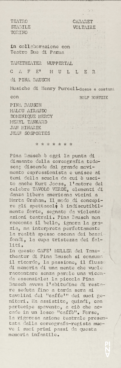 Abendzettel zu „Café Müller“ von Pina Bausch in Turin
