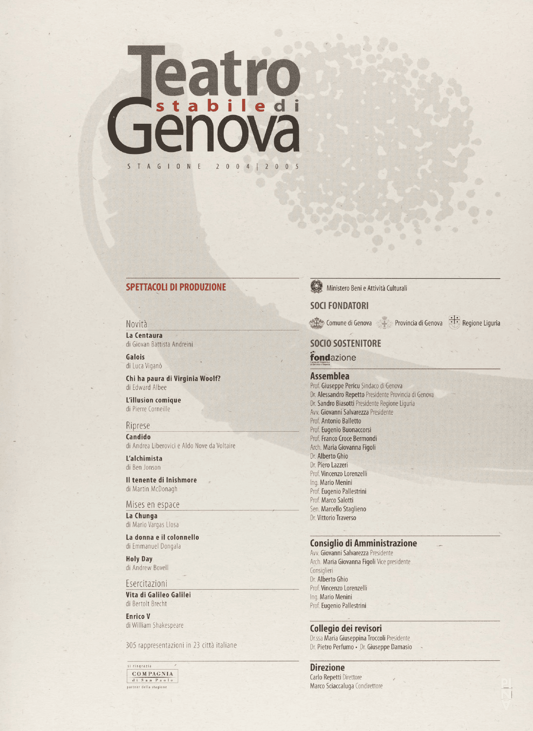 Programme de la saison pour « Kontakthof. Avec des dames et messieurs de plus de 65 ans » de Pina Bausch avec Kontakthof-Ensemble Damen und Herren ab ´65 à Gênes, 18 nov. 2004 – 21 nov. 2004