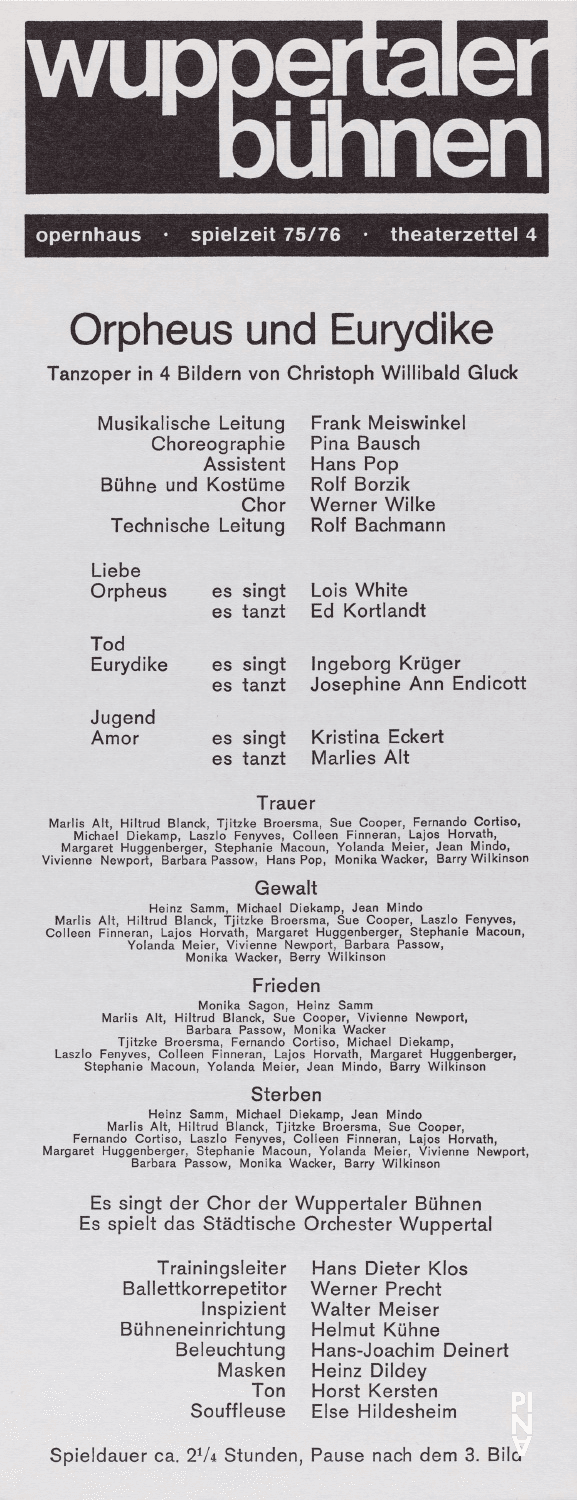 Programme pour « Orpheus und Eurydike » de Pina Bausch à Wuppertal, saison 1975/76